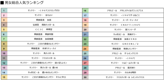 ・男性1位はサントリー「-196℃ストロングゼロ」、女性1位はサントリー「ほろよい」
