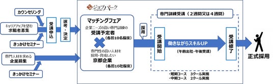専門職への就職・スキルアップに意欲的な求職者と、専門人材を求める京都企業をマッチングし、就職後に、企業でのOJT訓練と京都ジョブパークによる集合型訓練を組み合わせて、働きながらスキルアップしていく就職支援プログラム。