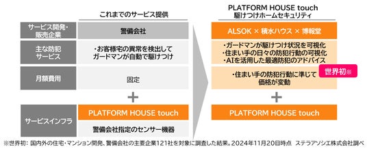 積水ハウス株式会社は、2023年9月から株式会社博報堂と協力し、ビッグデータで蓄積した生活ログをAIで解析し、住まい手の生活行動を分析し無意識の「行動の源泉」(潜在意識)を可視化することを目指しています。 今回、ALSOKをサービス提供者として迎え、世界初※1となる在宅時の行動や家の状態から防犯に関する行動習慣を可視化し価格に反映する、「PLATFORM HOUSE touch(プラットフォームハウス タッチ)」の駆けつけ防犯サービス「駆けつけホームセキュリティ」を12月13日より受付開始いたします。