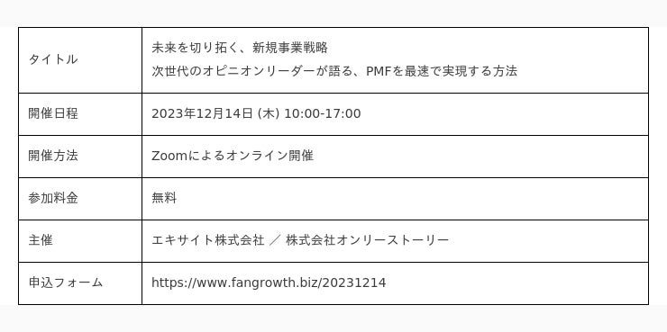 エキサイト株式会社(所在地:東京都港区、代表取締役社長:西條 晋一)は、「未来を切り拓く、新規事業戦略 次世代のオピニオンリーダーが語る、PMFを最速で実現する方法」と題し、2023年12月14日(木)10:00~参加無料のオンラインカンファレンスを開催します。 【お申し込みフォーム】https://www.fangrowth.biz/20231214