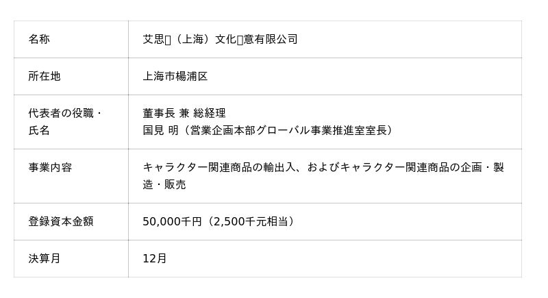 IPを活用した多彩な商品やサービスを展開する株式会社A3(本社:東京都豊島区、代表取締役:小澤 隆史、以下A3)は、この度、グローバル展開の一層の拡大を目的に、中国上海市に海外子会社「艾思丽(上海)文化创意有限公司」を2025年7月10日に設立したことをお知らせいたします。