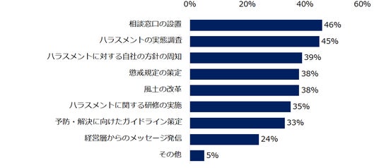 続いて「現在の職場ではハラスメント対策を実施していますか?」と伺ったところ、「実施している」が37%でした。これは、昨年(2023年)の同調査と比較して4ポイント低い結果です。「実施している」と回答した方に具体的な取り組みを伺うと、トップは「相談窓口の設置」(75%)でした。「ハラスメントのない職場にするために、企業にして欲しいことは何ですか?」と聞くと、トップ3は「相談窓口の設置」(46%)、「ハラスメントに関する研修の実施」(45%)、「ハラスメントに対する自社の方針の周知」(39%)でした。