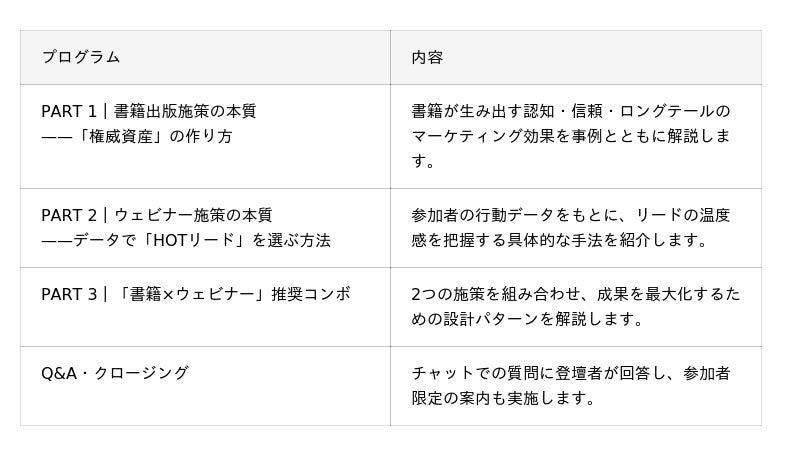 本ウェビナーでは、こうした課題に対し、「書籍出版」と「ウェビナー」を組み合わせることで、リード獲得から育成までを一貫した構造として再設計するアプローチをご紹介します。