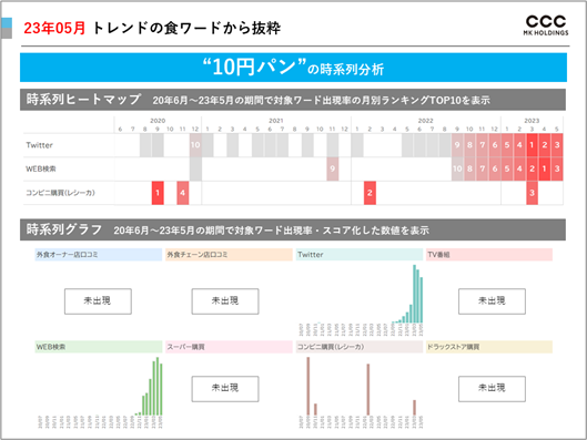 前年同月(2022年5月)と比較して伸びがみられた2023年5月のトレンドワードは、「10円パン」「麻婆麺」「生ドーナツ」でした。このうち、「10円パン」「生ドーナツ」についての分析を紹介します。