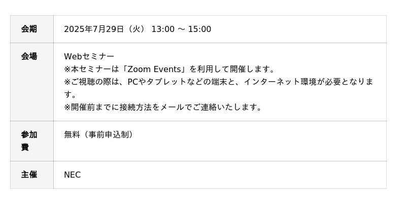 (詳細・お申込みはこちら)https://jpn.nec.com/event/250729sec/?cid=250729sec_0501開催概要