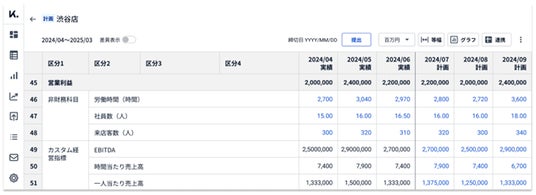 顧客企業ごとに任意の項目を設定し、来店客数、契約社数、社員数、労働時間などの非財務情報を、PLと合わせて管理することができる機能です。会計科目で構成されるPL表を拡張する機能で、財務情報と非財務情報を合わせて管理することで、実績や予算計画の分析をさらに充実させることが可能になります。