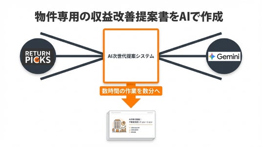 独自の収益計算ツール「リターンピックス(RETRUN PICKS)」のデータとAI(人工知能)を連携。専門知識が必要な財務シミュレーションを、AIが瞬時に「オーナーが納得するストーリー」へと変換し、提案書のクオリティを劇的に引き上げるノウハウを確立しました。