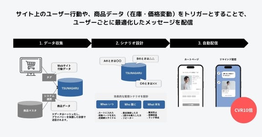 「TSUNAGARU for L-Trigger」は、ユーザーのWebサイト上での行動や、在庫数・価格といった商品データの変動をトリガーとして、LINE公式アカウントでの1to1のメッセージ配信を自動化するソリューションです。タグを活用してWebサイト行動とLINEユーザーIDを紐づけ、これまで配信が難しかったLINEのユーザーIDと会員IDが未連携のユーザー(※8)に対しても、リアルタイムでパーソナライズされたメッセージを配信することが可能です。これにより、配信対象者を狭めることなく企業のCTR(クリック率)やCVR(コンバージョン率)の向上に貢献します。