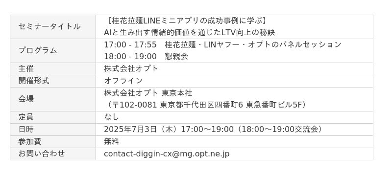 「新しい価値創造を通じて産業変革を起こし、社会課題を解決する。」をパーパスに掲げ、LTVM(LTV Marketing)(※1)により、顧客の事業成長を先導する株式会社オプト(本社:東京都千代田区、代表取締役社長:金澤 大輔、以下 オプト)は、本年7月3日(木)17時より、オフライン限定セミナー『【桂花拉麺LINEミニアプリの成功事例に学ぶ】AIと生み出す情緒的価値を通じたLTV向上の秘訣(以下、本セミナー)』を開催することを、お知らせいたします。