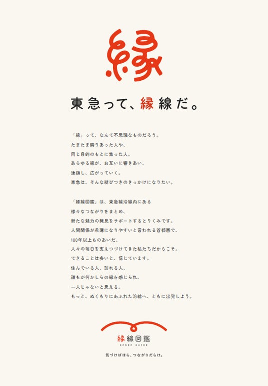 東急って縁線だ。「縁」って、なんて不思議なものだろう。たまたま隣りあった人や、同じ目的のもとに集った人。あらゆる縁が、お互いに響きあい、連鎖し、広がっていく。東急は、そんな結びつきのきっかけになりたい。「縁線図鑑」は、東急線沿線内にある様々なつながりをまとめ、新たな魅力の発見をサポートするとりくみです。人間関係が希薄になりやすいと言われる首都圏で、100年以上ものあいだ、人々の毎日を支えつづけてきた私たちだからこそ。できることは多いと、信じています。住んでいる人、訪れる人、誰もが何かしらの縁を感じられ、一人じゃないと思える。もっと、ぬくもりにあふれた沿線へ、ともに出発しよう。