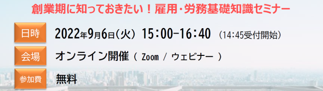 今般、関西圏雇用労働相談センターと連携し、創業期の企業に必要となる雇用・労務管理の基礎知識等を紹介し、円滑な事業運営につなげていただくことを目的として、「創業期に知っておきたい!雇用・労務基礎セミナー」を開催します。