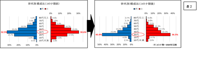 最も多かったのが、コロナ期以降は20代が男女とも最も高い構成比と
