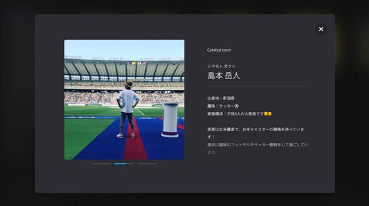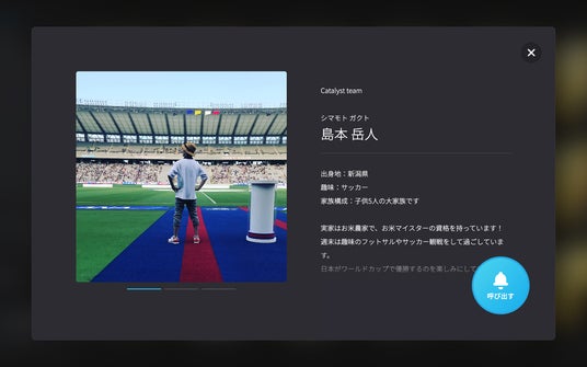顔写真を選択すると、社員のプロフィール情報が表示された呼び出し画面になります。出身地や趣味など、プロフィール欄に載せる事柄はそれぞれ社員の自由です。また、一覧写真と異なる写真も載せられるので、自分らしさをアピールする写真を載せれば、より個性や人柄が伝わりやすくなります。
