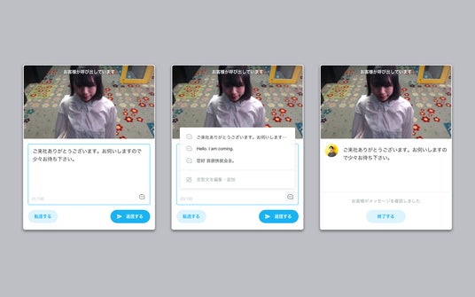 呼び出しがあると専用応答アプリが立ち上がり、WEBカメラを通じて来訪者の姿を確認しながらメッセージを送ることができます。