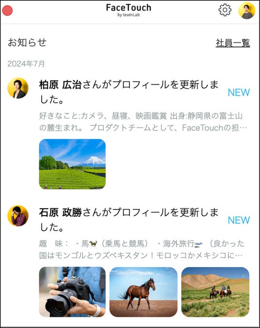FaceTouchに登録されている社員自身が、社内でどんな人が働いているのかを見ることができる「社員一覧機能」と、他の社員のプロフィールが更新されると通知される「お知らせ機能」です。