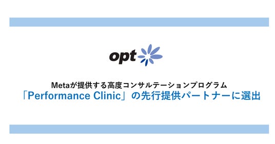 「新しい価値創造を通じて産業変革を起こし、社会課題を解決する。」をパーパスに掲げ、LTVM(LTV Marketing)(※)により、顧客の事業成長を先導する株式会社オプト(本社:東京都千代田区、代表取締役社長:金澤 大輔、以下 オプト)は、Meta日本法人 Facebook Japan(本社:アメリカ合衆国、日本法人代表取締役:味澤 将宏、以下、Meta)が提供する、パーソナライズ型コンサルテーションプログラム「Performance Clinic(パフォーマンス・クリニック)」の先行提供パートナーに選出されたことをお知らせいたします。