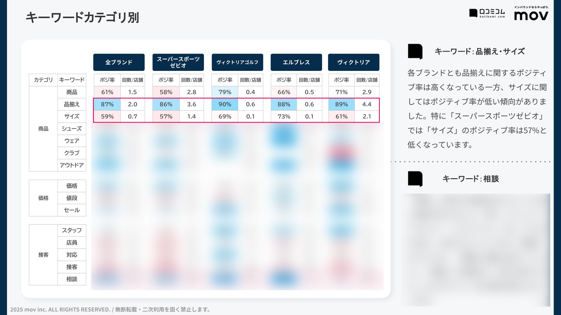 各ブランドとも品揃えに関するポジティブ率は高くなっている一方、サイズに関してはポジティブ率が低い傾向がありました。特に「スーパースポーツゼビオ」では「サイズ」のポジティブ率は57%と低くなっています。
