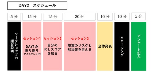 2日目は、DAY1で得られた気づきやチームの一体感を、実務に活かすためのワークショップを中心に実施します。まず、独自の指標である「レジリエントライフスコア※」を用いて、参加者一人ひとりのレジリエンスタイプを診断します。これにより、個人の強みを客観的に把握すると同時に、チーム全体としてどのような特性を持つのかを可視化します。その上で、チームの実務に潜むリスクや課題をチーム全員で洗い出します。最終的に各自のレジリエンスタイプも踏まえながら、チームとしてのリスク対処法を考えます。