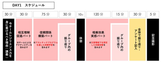 本研修は、個人と組織のレジリエンス向上を目的として構成された2日間の体験型研修です。参加者個人と組織がそれぞれ目標を設定し、体験と振り返りのサイクルを繰り返すことで、職場での実践的なチームワークとつながりを身につけていきます。