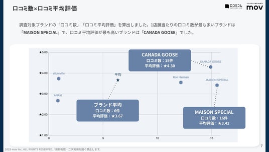 調査対象ブランドの「口コミ数」「口コミ平均評価」を算出しました。1店舗当たりの口コミ数が最も多いブランドは「MAISON SPECIAL」で、口コミ平均評価が最も高いブランドは「CANADA GOOSE」でした。