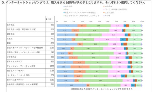 前段で「生鮮食品」「加工食品」では実店舗利用派が多いという結果をご紹介しましたが、食品は買ってすぐに食べる・調理するという「スピード感」や、食べ物は自分の目で確認して買いたいという思いが実店舗の利用につながっているのかもしれません。