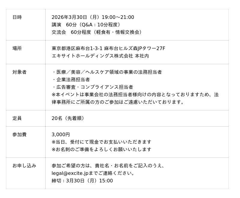 エキサイトホールディングス株式会社(本社:東京都港区、代表取締役社長:西條 晋一)は、医療・美容・ヘルスケア領域の法務担当者・広告審査担当者を対象に「現場で使える医療広告審査の基準」をテーマにした実務セミナーを3月30日(月)に麻布台ヒルズ本社内にて開催することをお知らせいたします。