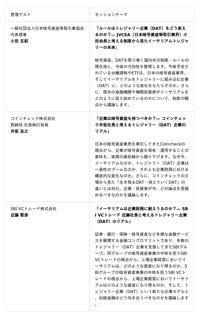 ■イベント特設サイト公開について本日公開した「Ethereum Shift 2026」イベント特設サイトでは、本イベントの開催趣旨や概要に加え、第1弾ゲストおよび当該ゲストによるセッション内容を公開しております。