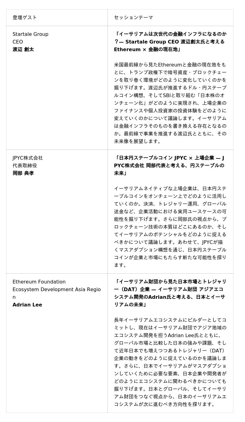 ■イベント特設サイト公開について本日公開した「Ethereum Shift 2026」イベント特設サイトでは、本イベントの開催趣旨や概要に加え、第1弾ゲストおよび当該ゲストによるセッション内容を公開しております。