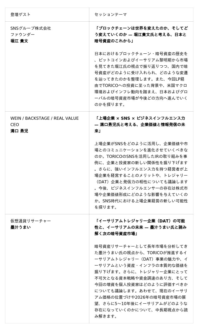 株式会社TORICO株式会社TORICO(本社:東京都千代田区、代表取締役社長:安藤拓郎、以下「当社」)は、Web3に関するメディア事業・イベント事業を展開する株式会社CoinPost(本社:東京都千代田区、代表取締役:各務貴仁、以下「CoinPost」)と共催で開催するオンラインイベント「Ethereum Shift 2026」に関し、第三弾となる登壇ゲストを公開するとともに、本第三弾の公開をもって、本イベントに登壇予定の全ゲストを公開いたしましたので、下記の通りお知らせいたします。