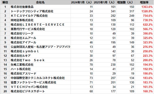 (※増加率=(2025年従業員数 - 2024年従業員数) ÷ 2024年従業員数 × 100)