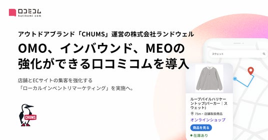 株式会社mov(代表取締役:渡邊 誠、本社:東京都渋谷区)が提供する店舗向け集客一元化プラットフォーム「口コミコム」が、アウトドアブランド「CHUMS」等を運営する株式会社ランドウェル(代表取締役:土屋 芳隆、本社:東京都港区)において、OMO強化および実店舗・自社ECサイトへの集客強化を目的としたローカルインベントリマーケティング施策として採用されたことをお知らせいたします。
