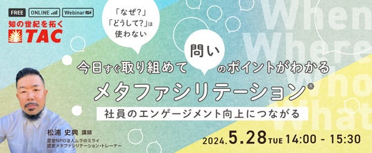 公認会計士や税理士など、多くの国家資格や検定試験の受験指導などの教育事業を展開しているTAC株式会社(東京都千代田区、代表取締役:多田敏男)は、法人向け人材教育部門から、人事・教育担当者に向けて、すぐ取り組め「問い」のポイントがわかるメタファシリテーションセミナーを2024年5月28日(火)に実施します。