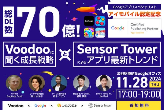 株式会社アイモバイル(本社:東京都渋谷区、代表取締役社長:野口哲也、東証プライム市場)のメディアソリューション事業( https://www.im-mediasolution.com/gcpp/ )は、11/28(木)17:00より、リアルイベント「【祝!来日】総アプリDL数70億「Voodoo」に聞くグロース戦略、Sensor Towerが語る最新アプリトレンド」を開催いたします。