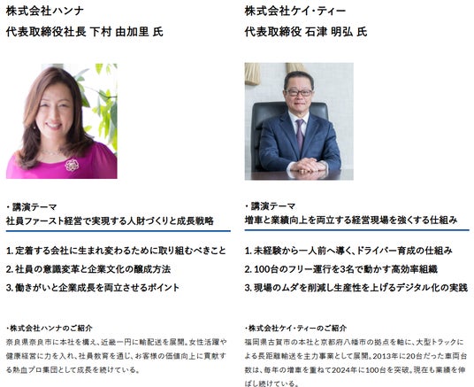 一方で、順風満帆な物流会社もいます。好調企業と苦戦している企業にはどのような違いがあるのでしょうか?今回のセミナーでは、ゲスト企業を2社お招きし、人財づくりの取り組みや10年で売上5.6倍(3億→16.8億)に伸ばした成長戦略について、お話しいただきます。