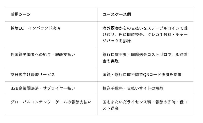 円建てステーブルコインは、既存の決済・送金インフラでは解決が難しかった課題を、低コストで解消できるユースケースを生み出します。