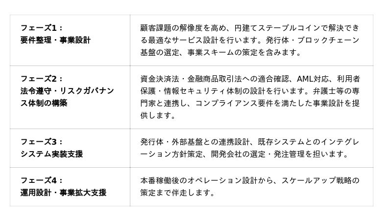 ステーブルコインの社会実装に向けた環境は急速に整いつつあります。しかし、ステーブルコインを活用した事業を実際に立ち上げるには、ユースケースの設計・技術選定・法令対応・監査対応・AML体制構築など、複数領域を横断した統合的な設計力が必要となり、構想やPoC(実証実験)段階で止まるケースが少なくありません。
