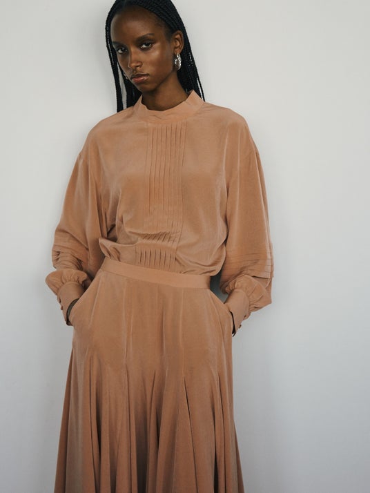 8月23日(金)より公開するAutumn & Winter Collection Vol.1では、プリンスオブウェールズチェックを使用したシングルブレストのジャケットとリラックスフィットパンツのセットアップ、上品な光沢のファイユを使用したハイネックブラウスとサーキュラ―スカート、オーバーサイズのプロポーショ