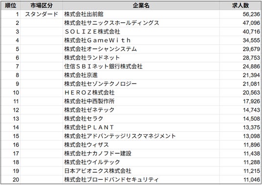 株式会社SalesNow(本社:東京都渋谷区、代表取締役:村岡功規、以下「当社」)は、国内540万社の企業情報を完全網羅した日本最大級のデータベース「SalesNow DB」より、スタンダード市場に上場する企業の求人数ランキングを集計しました。