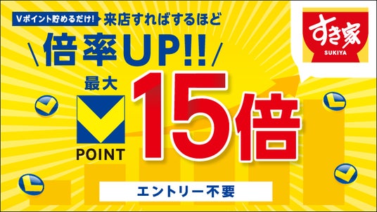 キャンペーン期間中、「すき家」店舗へのご来店時にモバイルVカードやTカードを提示いただくと、通常のお食事で貯まるVポイント(200円(税込)につき1ポイント)に加え、来店回数に応じて最大15倍のVポイントを進呈いたします。2回来店で2倍、3回来店で5倍、4回来店で10倍、5回以上の来店で15倍のVポイントが貯まります。