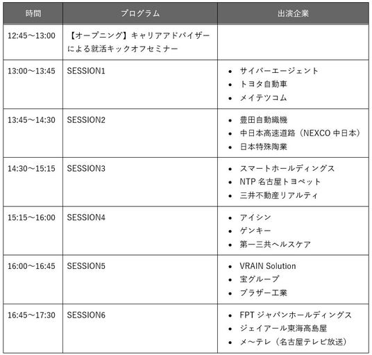 企業の新卒採用活動が前倒し傾向で、学生の就活も早期化傾向にある現在、インターンシップへの参加や企業研究に注力できる夏季休暇期間は、「どこで働くのか」を考えるには重要な時期です。そこで、東海エリアにゆかりのある学生が夏季を有意義に活用できるきっかけの場として、本イベントを企画しました。