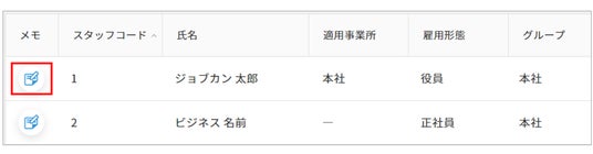 ■具体的な機能・操作・メモの作成従業員一覧画面から、メモ・アラートを設定したい従業員の欄の左にあるアイコンをクリックします。遷移先の画面でメモの記入とカラー選択が可能です。