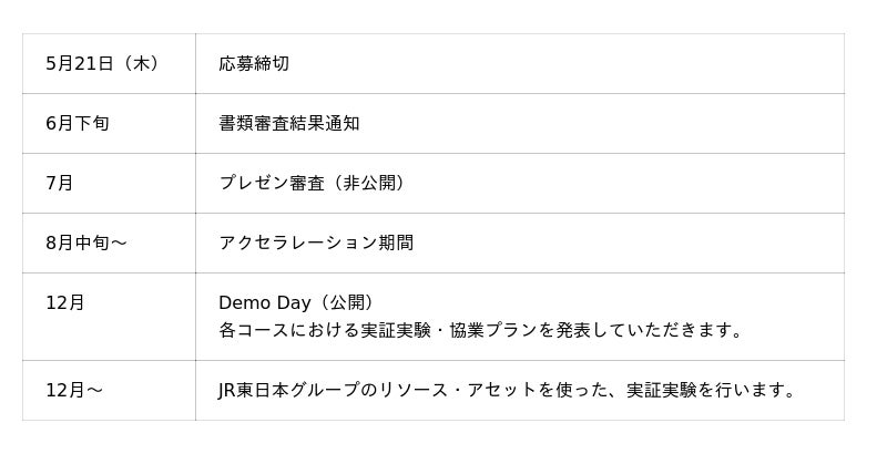 ただし、今回の公募プログラムによらず、JR東日本グループが独自で同一または類似の商品・サービス・技術などを既に開発している、または将来開発する可能性があることをご了承ください。