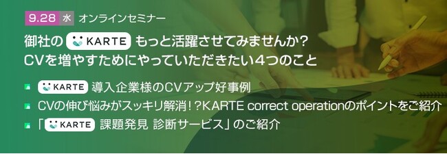 トランスコスモス株式会社(代表取締役共同社長:石見浩一、牟田正明)は、オンラインセミナー御社の「KARTE」、もっと活躍させてみませんか?を9月28日(水)に開催します。