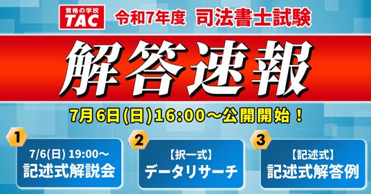 司法書士試験対策講座を展開しているTAC株式会社(東京都千代田区、代表取締役:多田敏男)は7/6(日)に実施される令和7年度司法書士試験の「解答速報」を試験当日にTACのWebサイトで公開します。また、自己採点が難しい記述式試験を即日検証する「オンライン記述式解説会」を同日にYouTubeでLIVE配信します。さらに、本試験日以降は各種特別セミナーやオンライン個別相談会など、本試験後にやるべきことをチェックできます。