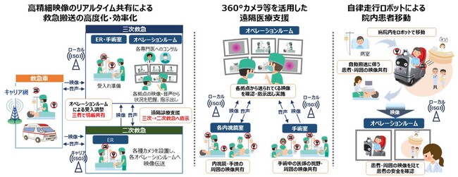 本実証では、ローカル5Gの超高速の特性を活かし「広域連携、遠隔診療、院内MaaS」の3つのテーマで開発実証を行います。ローカル5Gとキャリア5G等(公衆網)がシームレスに連携する通信インフラに、映像共有ソリューションや自律走行ロボットといったローカル5G活用モデルを構築します。三次救急医療機関の聖マリアンナ医科大学(川崎市宮前区)と二次救急医療機関の川崎市立多摩病院(川崎市多摩区)を実証フィールドとして、地域の医療機関が連携した緊急性の高い患者に確実な救急医療資源の提供が行える医療供給体制の強靭化、加えて、医師だけでなく、看護師や診療看護師などのタスクシフトや業務効率化(働き方改革)が実現された、より高い質の医療が提供できる社会を目指します。