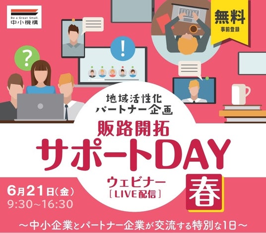 独立行政法人中小企業基盤整備機構(理事長:宮川正 本部:東京都港区)は、より多くの方々に地域活性化パートナー企画を活用していただくため、地域活性化パートナー企画「販路開拓サポートDAY 春」を6月21日(金曜)にオンラインで開催します。