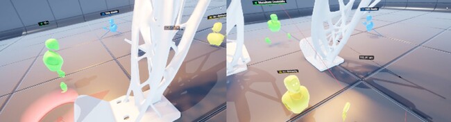 AM最適化設計(DfAM)を経て作成した部品の3Dモデルをレビューするタイミングで試行。ものづくりネットワーク沖縄の沖縄拠点にいるメンバー、応用技術の大阪オフィスにいるメンバー、トランスコスモス東京オフィスにいるメンバーが、VRゴーグルを装着し、独自に開発したVR空間に同時アクセス。作成した電動ゴーカートのフロントバンパーブラケットの造形前3Dモデルをレビューしました。試行の結果、複数拠点からの同時接続であっても遅延なくコミュニケーションでき、非常に重い3D設計データも違和感なく表示できたため、バーチャルデザインレビューは試作品を前にしたリアルな場でのデザインレビューと近い感覚でおこなえることがわかりました。