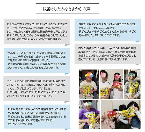 今年度も引き続き取組姿勢を全国に示し、お米を通してつくばみらい市を知ってもらうとともに、ひとり親家庭及び生産者支援に繋げていきたいと思います。