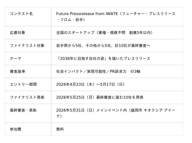 プレスリリース配信サービス「PR TIMES」等を運営する株式会社PR TIMES(東京都港区、代表取締役:山口拓己、東証プライム・名証プレミア:3922)が公認する「プレスリリースエバンジェリスト」の有志らは、岩手県の企業や大学と連携し、県内の事業者や子どもたちの情報発信力の向上に挑む「チャグチャグいわてPRプロジェクト2026」を推進しています。このたびスタートアップ支援部門では、岩手県および全国のスタートアップを対象とした初企画、10年後に目指す未来の自社の姿を描き岩手から発信するコンテスト「Future Pressrelease from IWATE(フューチャー・プレスリリース・フロム・岩手)」の参加募集を2026年4月23日(木)より開始いたしました。審査員は、国内最大級のスタートアップ転職サイトを運営する専門家と、グローバルに活躍してきたメディア関係者。採用と組織成長のリアルな知見に触れながら、世界を見てきた記者たちから直接フィードバックを受けることで、参加スタートアップが世界へ羽ばたくための広報力・発信力を磨く、貴重な機会となります。応募締切は5月17日(日)です。エントリーを検討しているスタートアップ向けにオンライン説明会を2回(4/30・5/7、いずれも平日・無料)開催します(詳細後述)。このコンテストで得られること ※参加は無料です・テレビ・新聞など主要メディアに従事する審査員へ、直接プレゼンの機会