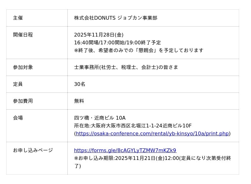 株式会社DONUTS(東京都渋谷区、代表取締役:西村啓成)が提供するバックオフィス支援クラウドERPシステム「ジョブカン」は、士業事務所の方を対象とした「体験型イベント&士業交流会」を2025年11月28日(金)に大阪で開催いたします。